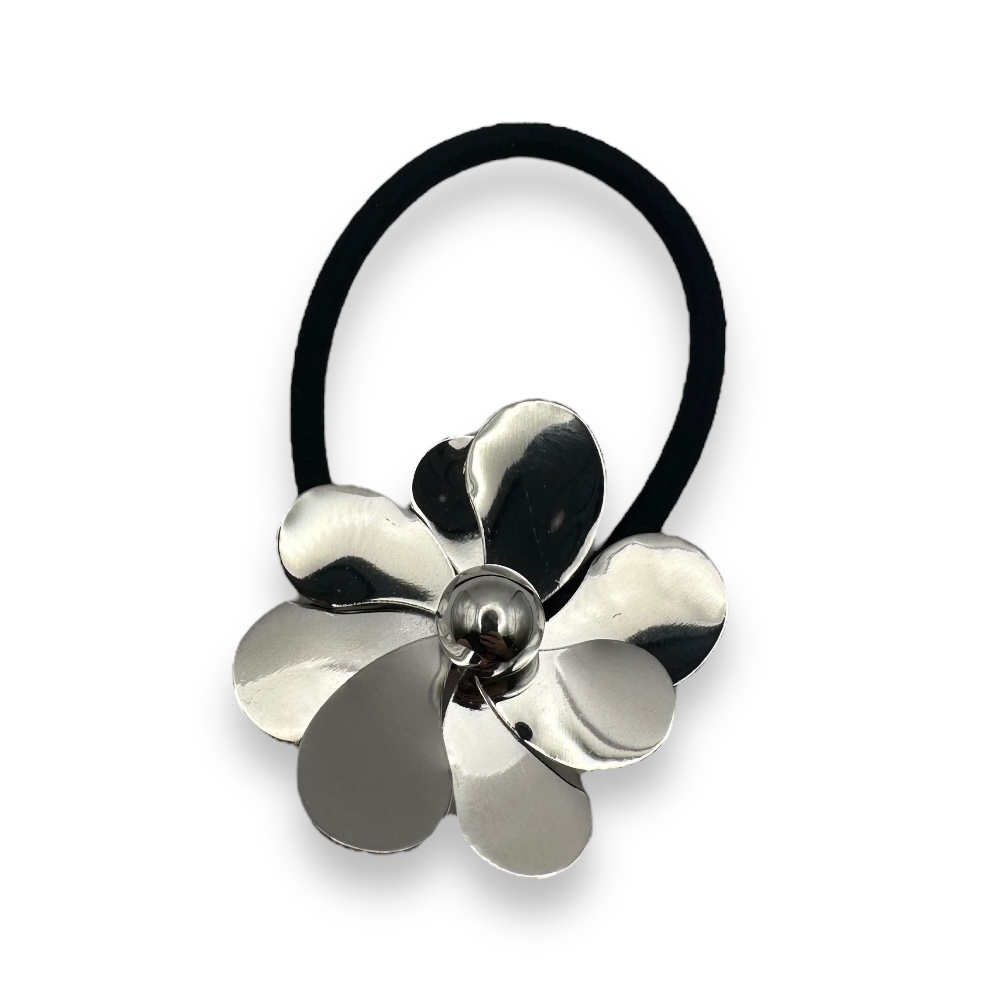 Elástico de cabelo preto com broche em metal prateado de flor metalizada prateada e uma esfera prateada no meio como se fosse o miolo da flor.